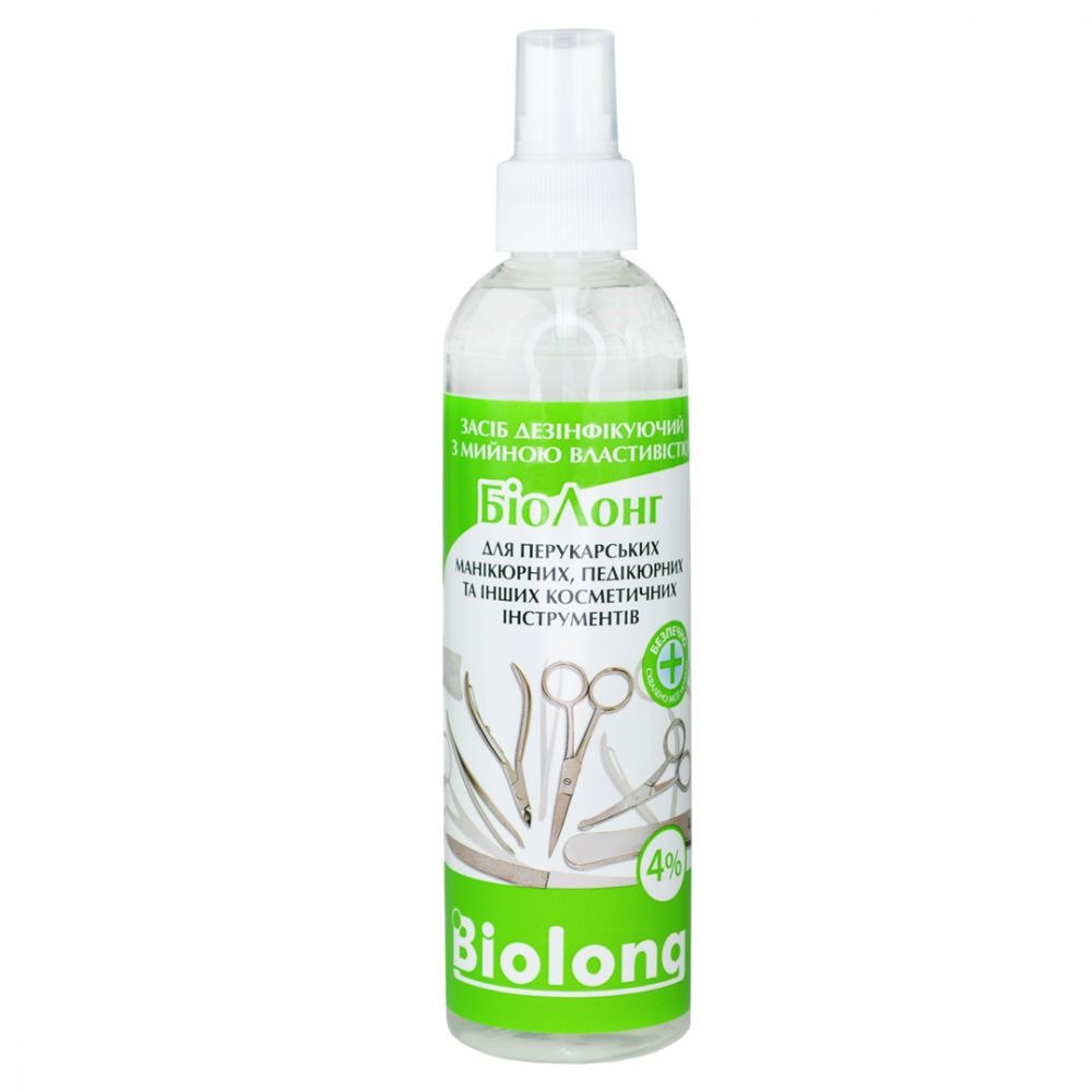 Використання: нанести БіоЛонг за допомогою розпилювача на поверхню інструментів. Видалити серветкою всі види забруднень з усією поверхні інструменту. Нанести БіоЛонг повторно і залишити до висихання або занурити інструменти в розчин на 5 хв.