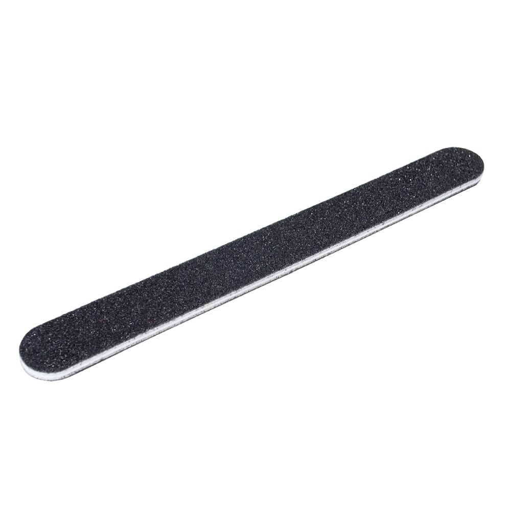 Профессиональная пилка для ногтей стандартной длины, шириной 19 мм на широком конце и 8 мм на узком. На деревянную основу с одной стороны нанесен средний абразив 150 грит, с другой – мелкий 240 грит. Пилка тонкая и очень удобная — позволяет работать с труднодоступными зонами ногтя, открывает хороший обзор мастеру.