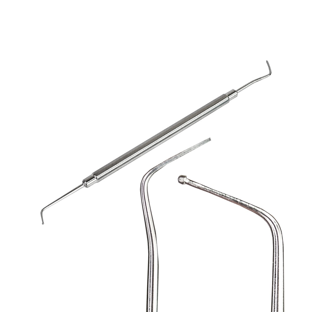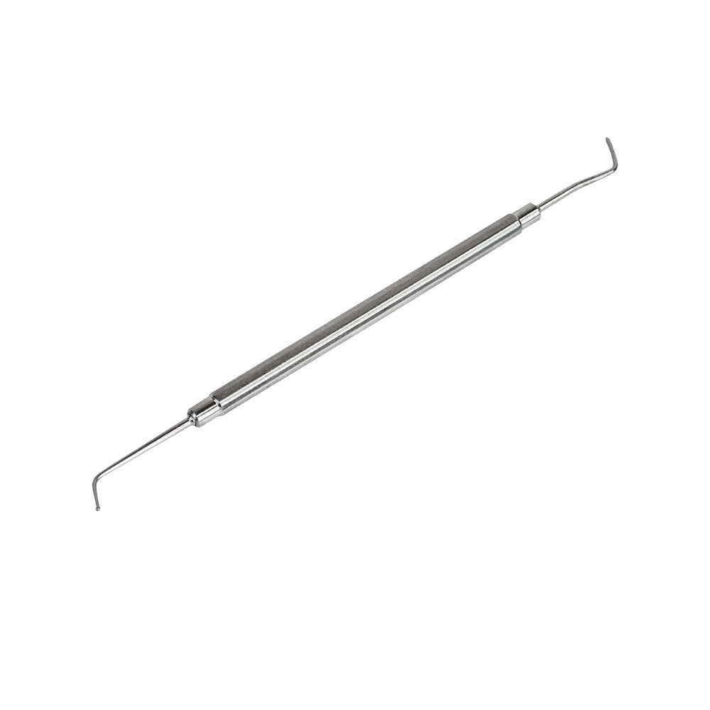 Двусторонний штопфер используется при выполнении педикюра для чистки боковых валиков, а также для обнаружения вросшего ногтя и работы с ним.Данный инструмент изготовлен из медицинской стали и подлежит всем видам дезинфекции и стерилизации.