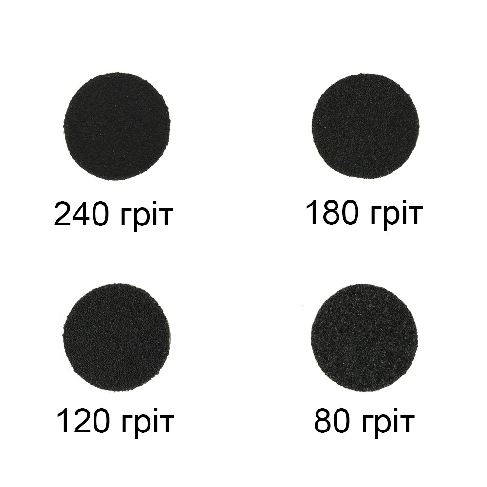 Кількість файлів у наборі: 50 шт Абразив: 240 гріт - дуже дрібний, м'який Діаметр: 25 мм Набір змінних абразивних файлів для фрезерної машинки. За рахунок спеціальної клейкої основи, наждакові наклейки не зміщуються і не відклеюються від педикюрного диску під час виконання процедури, при цьому легко знімаються після використання. Змінні файли виготовлені з водостійких матеріалів і можуть застосовуватися в усіх видах педикюру.